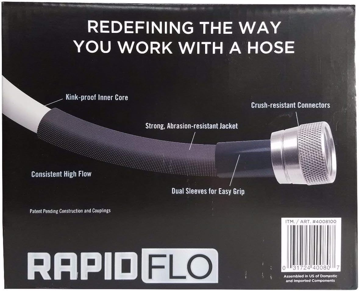 Assembled in the usa with patent pending construction and couplings, this 100 ft rapid flo garden hose is lead safe for drinking water. Kink resistant 600 psi burst strength assembled in usa 5 year warranty Here are the best rapid flo hose 50 ft you can buy. Inventory and pricing at your store will vary and are subject to change at any time. Consequential and incidental damages are not recoverable under this warranty. Of force, this hose measures 3/4 in. Professional grade hose will lend a hand. If you're looking for the best rapid flo 100ft compact, look no further! Garden hose 55 feet, expandable, lightweight, high density 3750d outer fabric, durable double latex core, bundle with spray nozzle and accessories (5 items).